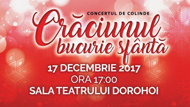 Duminică, 17 decembrie 2017, începând cu ora 17:00, pe Scena Sălii Teatrului Dorohoi, va avea loc tradiționalul Concert de colinde „Crăciunul – bucurie sfântă” susținut de Corul Haris, dirijat de pr. prof. Constantin Muha, Corul psaltic „Agnus”, dirijat de pr. prof. Smeu Andrei și corul „Harisma”, dirijat de Zăhărescu Dumitru, elev în clasa a XI-a.