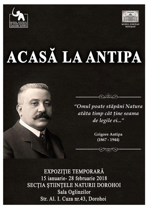 Muzeul Judeţean Botoșani, Secţia Ştiinţele Naturii Dorohoi, în colaborare cu Muzeul Naţional de Istorie Naturală „Grigore Antipa”, organizează în perioada 15 ianuarie – 28 februarie, la sediul muzeului din Dorohoi, expoziţia temporară „Acasă la Antipa”