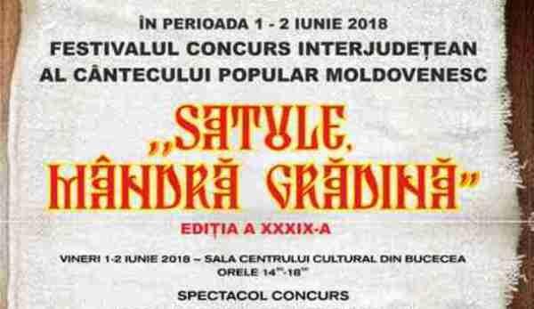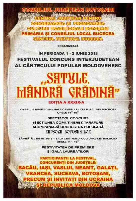 Centrul Judeţean pentru Conservarea şi Promovarea Culturii Tradiţionale Botoşani, instituţie de cultură aflată în subordonarea Consiliului Judeţean Botoşani, în parteneriat cu Primăria şi Consiliul Local Bucecea şi Centrul Cultural Bucecea, organizează în perioada 1–2 iunie 2018, FESTIVALUL-CONCURS AL CÂNTECULUI POPULAR MOLDOVENESC „SATULE, MÂNDRĂ GRĂDINĂ”, ediţia a XXXIX-a.