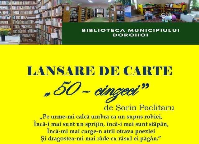 Asociația Culturală Integritas în colaborare cu Biblioteca Municipiului Dorohoi vă invită vineri, 29 iunie 2018, ora 17:00, la evenimentul de lansare a volumului de poezie intitulat „50 – cincizeci” al poetului Sorin Poclitaru.
