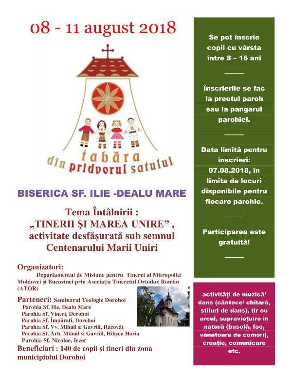 „Tabăra din Pridvorul Satului” care se va desfășura la parohia Dealu-Mare Dorohoi, în perioada 8-11 august 2018.