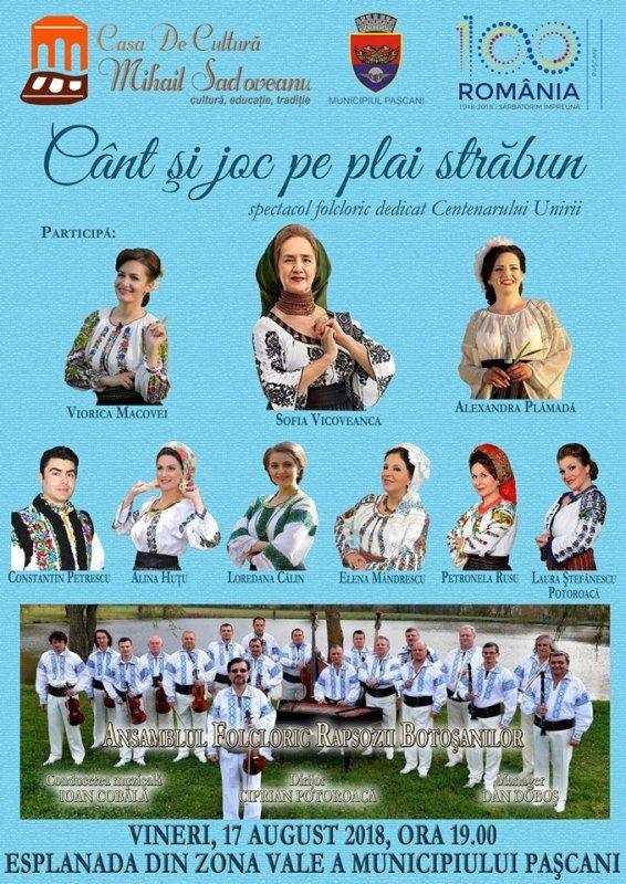 De asemenea Orchestra Populara „Rapsozii Botosanilor” va fi prezenta pe data de 17 august 2018 orele 19.00 in orasul Pascani la spectacolull folcloric dedicat centenarului Marii Uniri intitulat „Cant si Joc pe Plai Strabun”, organizat de Primaria municipiului Pascani si Casa de Cultura Mihail Sadoveanu. Conducerea muzicala va fi asigurata de maestrul Ioan Cobala; Dirijor: Ciprian Potoroaca; Manager: Dan Dobos.