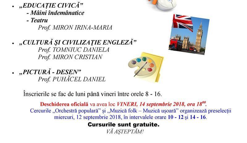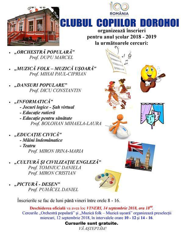 Începând de luni, 3 septembrie 2018, între orele 08:00-16:00, părinții, copiii și elevii din municipiul Dorohoi şi localităţile alăturate sunt aşteptaţi la Clubul Copiilor Dorohoi pentru înscrierea la cercurile care vor funcţiona în acest an școlar: