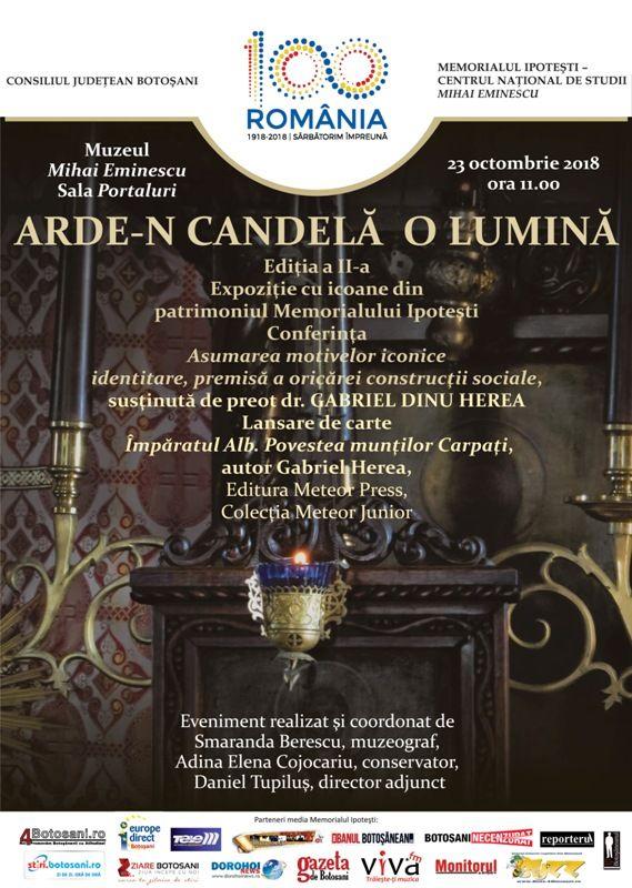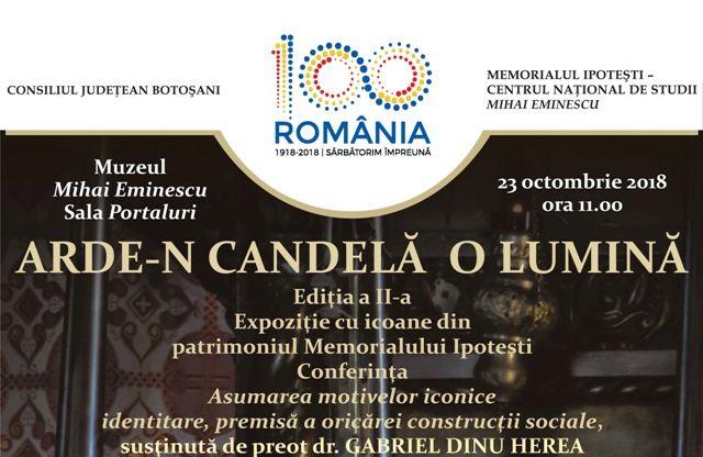 Activităţile dedicate Centenarului Marii Uniri continuă, la Memorialul Ipoteşti – Centrul Naţional Mihai Eminescu, în data de 23 octombrie 2018 cu expoziţia Arde-n candelă o lumină. Ediţia a II-a, care evidenţiază rolul bisericii în înfăptuirea Marii Uniri.
