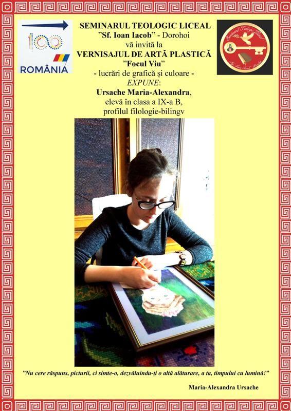 În anul 2018 comemorăm 100 de ani de la desăvârșirea statului național român, realizată prin unire a provinciilor românești cu România. În șirul activităților desfășurate cu acest prilej la Seminarul Teologic „Sf. Ioan Iacob” Dorohoi se numără și expoziția de pictură a tinerei Ursache Maria Alexandra, elevă în clasa a IX-a la profilul Filologie bilingv.