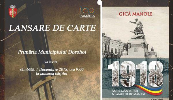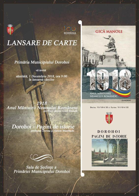 Primăria municipiului Dorohoi, vă invită să participați, sâmbătă 1 decembrie, ora 09:00 în sala de ședință a primăriei, la lansarea cărților „1918”, autor Gică Manole și „Dorohoi, File de Istorie”, autor Dorina Mandachi, Ilarion Mandachi.