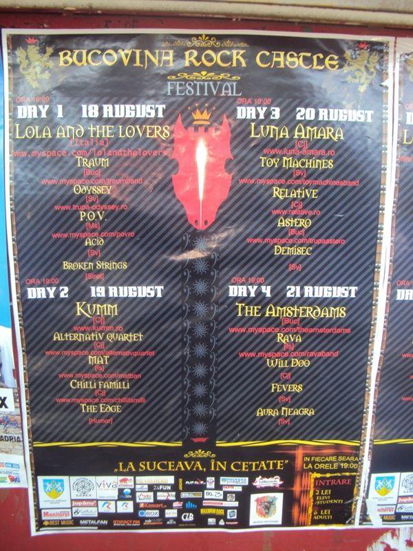 Nici bine nu s-au terminat „Serile Medievale" la Suceava că, oraşul se îmbracă din nou în haine de sărbătoare. De data aceasta, Suceava va găzdui în perioada 18 -21 august anul curent, festivalul de muzică rock: "Bucovina Rock Castle". Evenimentul va avea loc la Cetatea de Scaun, iar intrarea va fi 2 lei pentru elevi / studenţi şi 6 lei pentru adulţi.