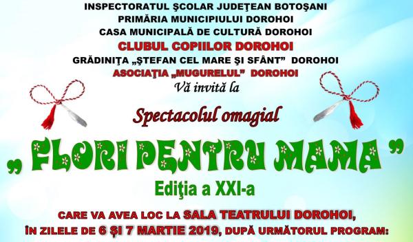 Sala Teatrului Dorohoi va găzdui în perioada 6-7 martie 2019 Concertul omagial „Flori pentru mama”, ediţia a XXI-a, organizat de Clubul Copiilor Dorohoi, cu sprijinul Inspectoratului Şcolar Judeţean Botoşani şi al Primăriei municipiului Dorohoi, în parteneriat cu Grădiniţa „Ştefan cel Mare şi Sfânt” Dorohoi, Asociaţia „Mugurelul” Dorohoi şi Casa Municipală de Cultură Dorohoi.