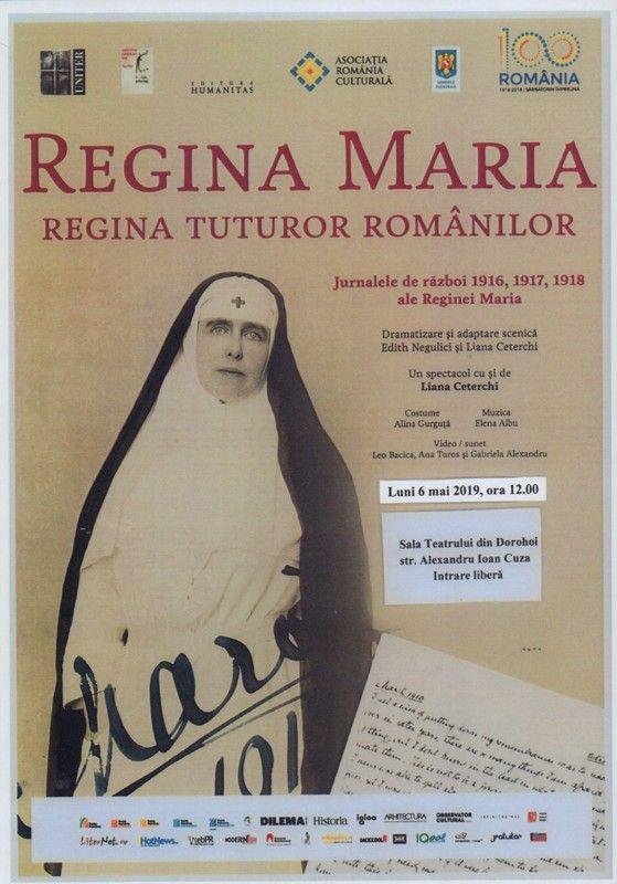 Luni 6 mai, ora 12:00, la Sala Teatrului din Dorohoi va avea loc spectacolul eveniment REGINA MARIA, REGINA TUTUROR ROMÂNILOR.