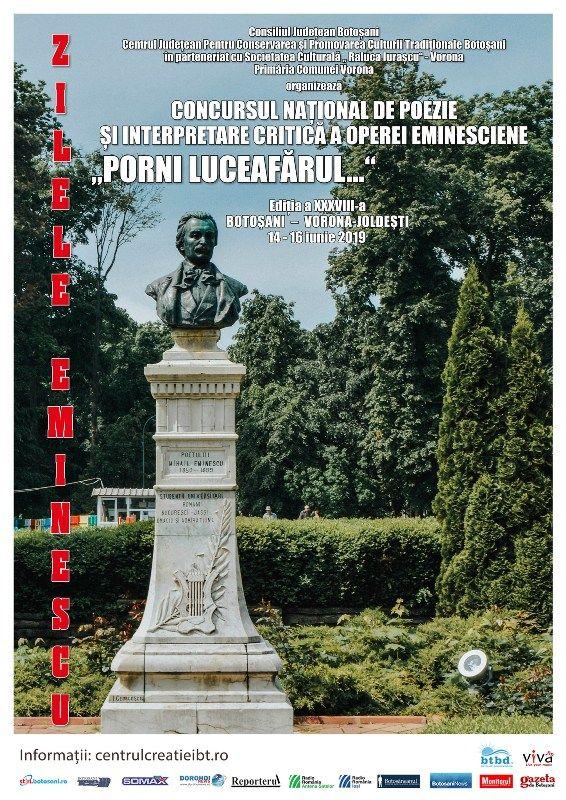 Cea de a XXXVIII-a ediţie a Concursului Naţional de Poezie şi Interpretare Critică a Operei Eminesciene „Porni Luceafărul…”, organizat de Centrul Judeţean pentru Conservarea şi Promovarea Culturii Tradiţionale Botoşani, cu sprijinul Consiliului Judeţean Botoşani, în parteneriat cu Societatea Culturală „Raluca Iuraşcu” Vorona şi în colaborare cu Primăria Comunei Vorona, va avea loc în perioada 14-16 iunie 2019 după următorul program: