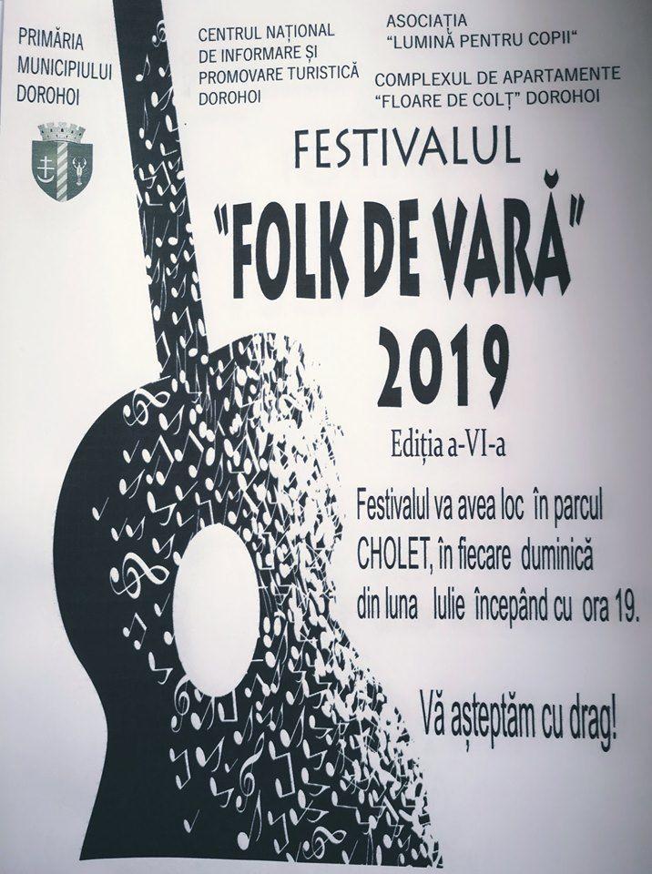 Asociația „Lumina PENTRU COPII” și Complexul „Floare de Colț” Dorohoi cu sprijinul Primăriei Municipiului Dorohoi prin Centrul Național de Informare și Promovare Turistică Dorohoi vă invită în Parcul Cholet Dorohoi în fiecare duminică din luna iulie începând cu ora 19:00 pentru a vă bucura de Festivalul „Folk de Vară” ediția a VI-a.
