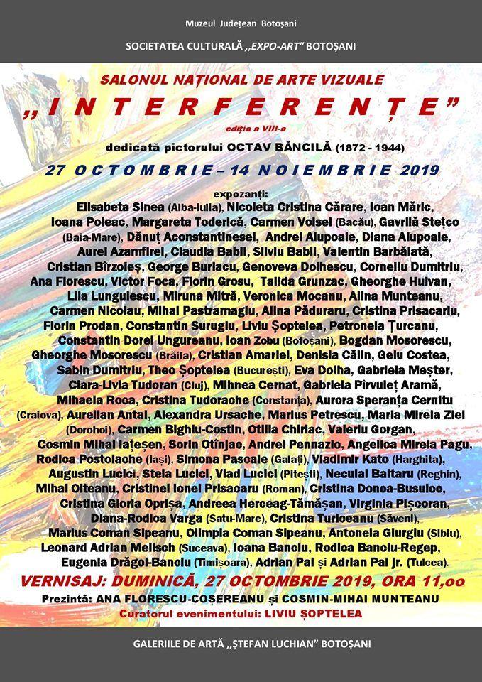Muzeul Judeţean Botoşani găzduieşte în perioada 27 octombrie – 14 noiembrie 2019, în spaţiul Galeriilor de Artă „Ştefan Luchian” Botoşani, Salonul Național de Arte Vizuale „Interferențe” - ediția a VIII-a, organizată de Societatea Culturală „Expo-Artˮ Botoșani, la care participă cu lucrările lor și cinci artiști plastici din Dorohoi, Aurelian Antal, Alexandra Ursache, Valeriu Gorgan, Maria Mirela Zlei și Marius Petrescu.