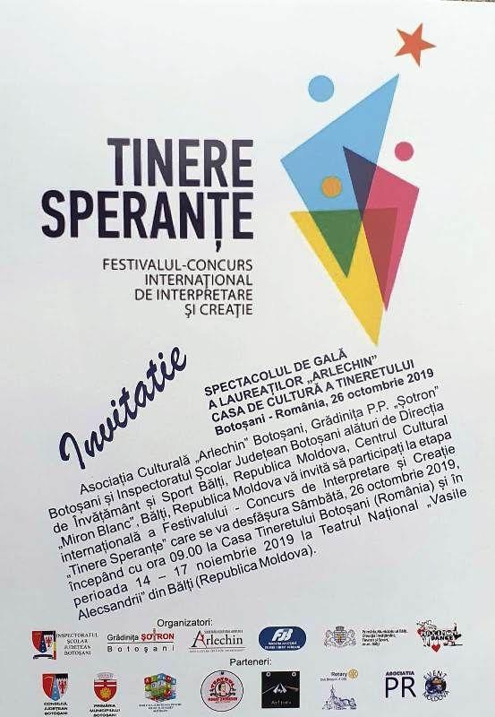 Asociatia Culturala „Arlechin” Botosani, Gradinita P.P. ”Sotron” Botosani si Inspectoratul Scolar Judetean Botosani alaturi de Directia de Invatamant si Sport Balti, Republica Moldova, Centrul Cultural „Miron Blanc”, Balti, Republica Moldova vă invită să participați la etapa internatională a Festivalului - Concurs de Interpretare și Creație „Tinere Speranțe”, 2019.