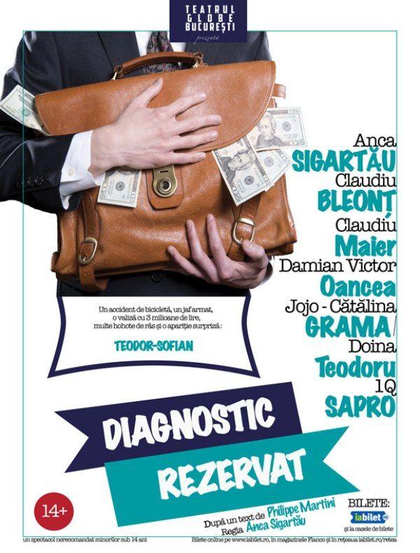 Acestea sunt ingredientele principale ale piesei de teatru Diagnostic rezervat, o comedie extraordinară adaptată după textul autorului francez Philippe Martini, care îi aduce laolaltă pe Anca Sigartau, Claudiu Bleont, Catalina Grama (Jojo)/ Doina Teodoru, Claudiu Maier, Damian Victor Oancea, 1Q Sapro si Teodor Sofian.