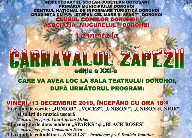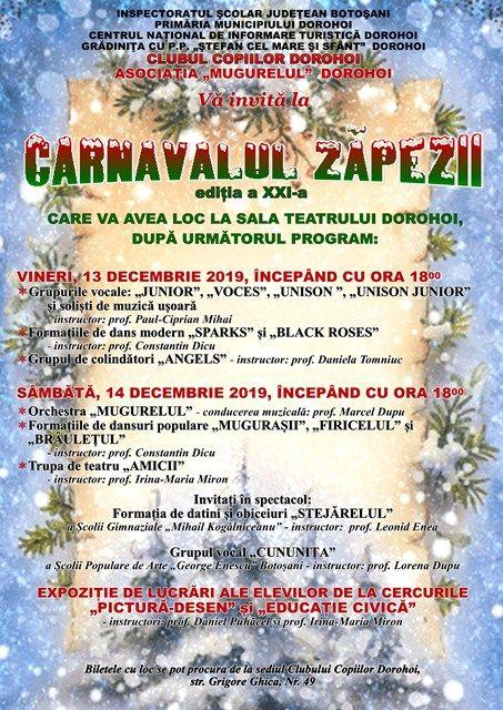Concertul tradiţional de sărbători „Carnavalul Zăpezii”, ediţia a XXI-a, organizat de Clubul Copiilor Dorohoi se va desfășura anul acesta, în zilele de 13 și 14 decembrie, la Sala Teatrului din Dorohoi, după următorul program:
