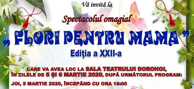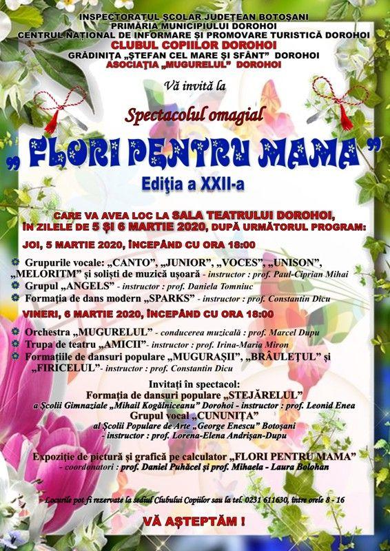 Sala Teatrului Dorohoi va găzdui în perioada 5-6 martie 2020 Concertul omagial „Flori pentru mama”, ediţia a XXII-a, organizat de Clubul Copiilor Dorohoi, cu sprijinul Inspectoratului Şcolar Judeţean Botoşani şi al Primăriei municipiului Dorohoi, în parteneriat cu Grădiniţa „Ştefan cel Mare şi Sfânt” Dorohoi, Asociaţia „Mugurelul” Dorohoi şi Casa Municipală de Cultură Dorohoi.