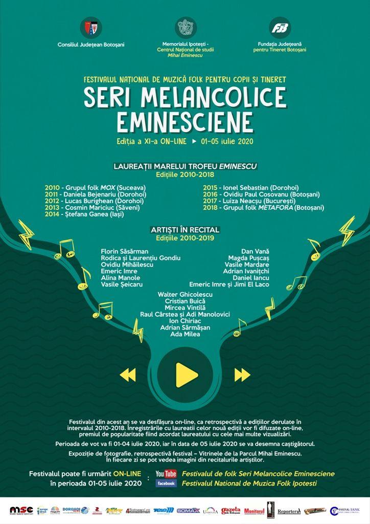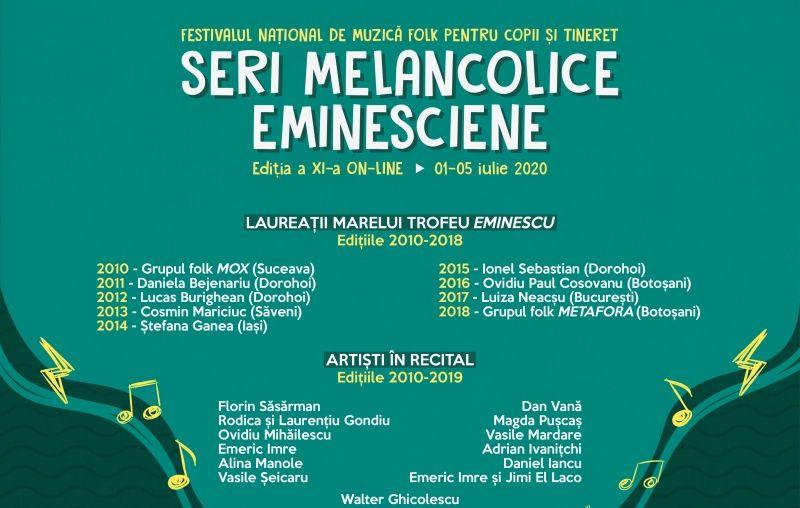 Memorialul Ipoteşti – Centrul Naţional de Studii Mihai Eminescu, în pareteneriat cu Fundația Județeană pentru Tineret  Botoşani, organizează Festivalul Naţional de Muzică Folk pentru Copii şi Tineret Seri melancolice eminesciene, ediţia a XI-a, on-line.