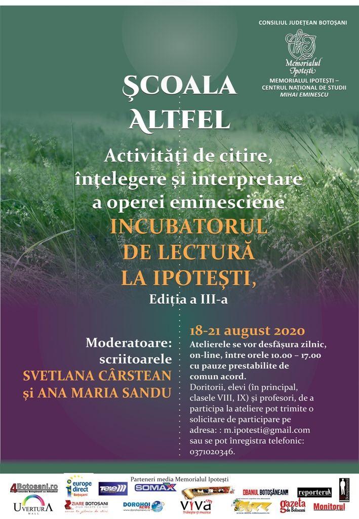 Sub genericul deja consacrat al Şcolii altfel, Memorialul Ipoteşti − Centrul Naţional de Studii Mihai Eminescu, organizează, în perioada 18-21 august 2020, Incubatorul de lectură, la care sunt invitați să participe profesori și elevi din județul Botoșani.