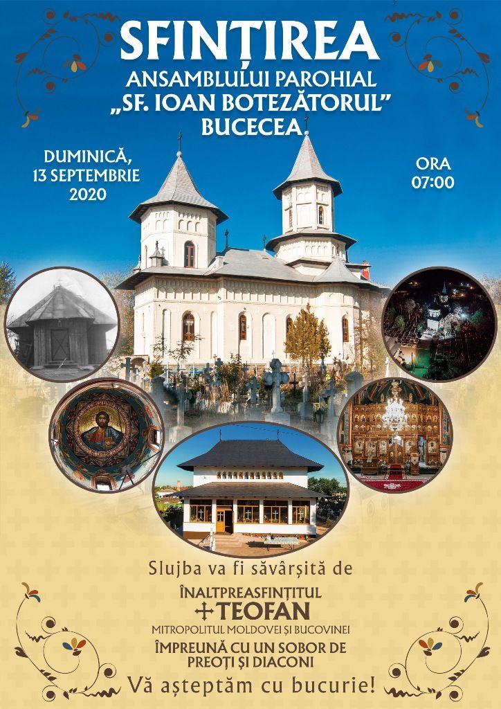 Un eveniment de o importanță deosebită pentru enoriașii Parohiei „Sfântul Ioan Botezătorul” - Bucecea, dar și a întregii comunități, va avea loc Duminică, 13 septembrie 2020, începând cu ora 07:00, când va fi săvârșită slujba de Sfințire a Ansamblului Parohial, de către Înaltpreasfințitul Teofan, Mitropolitul Moldovei și Bucovinei, împreună cu un sobor de preoți și diaconi.