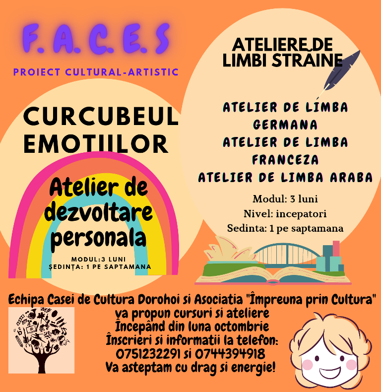 1. ATELIER DE DEZVOLTARE PERSONALĂCURCUBEUL EMOȚIILOR: fă echipă cu prichindelul tău și te așteptăm la Casa de Cultură unde alături de profesioniști vom organiza o serie de ateliere destinate copiilor și părinților.