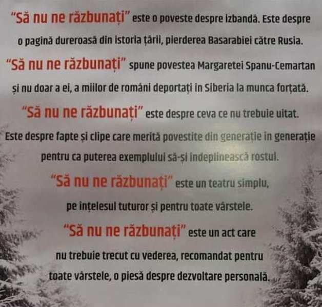 Teatrul „Vasilache” şi SC Televiziunea Locală Telem SRL prezintă în parteneriat spectacolul „Să nu ne răzbunaţi”, în cadrul STUDIOULUI DE TEATRU PENTRU TINERET. Spectacolul este programat pentru ziua de sâmbătă, 6 februarie 2021, cu începere de la ora 18:00.