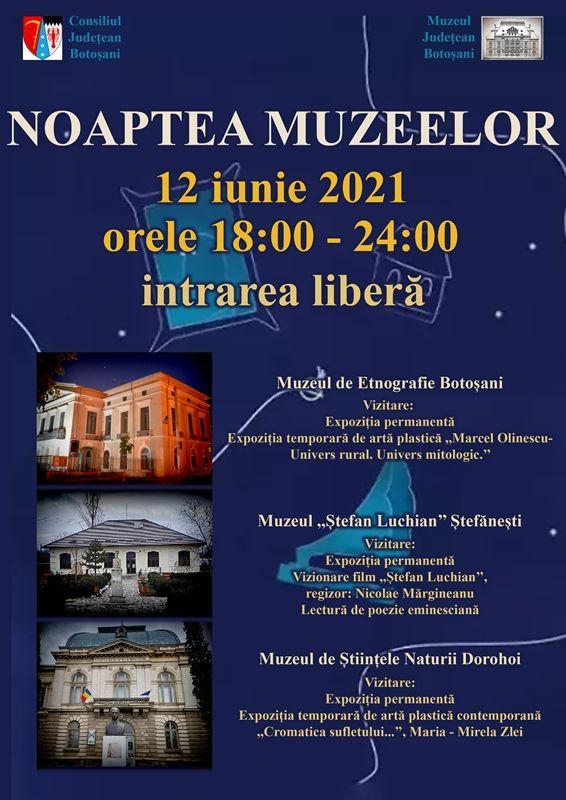 Muzeul Judeţean Botoşani organizează sâmbătă, 12 iunie 2021, evenimentul cultural Noaptea Muzeelor. Evenimentul cultural se inscrie în cadrul celui organizat anual la nivel european sub patronajul Consiliului Europei, UNESCO, Consiliului Internațional al Muzeelor și Rețeaua Națională a Muzeelor din care și instituția noastră face parte. În acest an vor putea fi vizitate, în intervalul orar 18.00-23.30, Muzeul de Etnografie Botoșani, Muzeul „Ștefan Luchian” Ștefănești și Muzeul de Științele Naturii Dorohoi (ora anunţată pentru închidere reprezentând ora de intrare a ultimului vizitator).