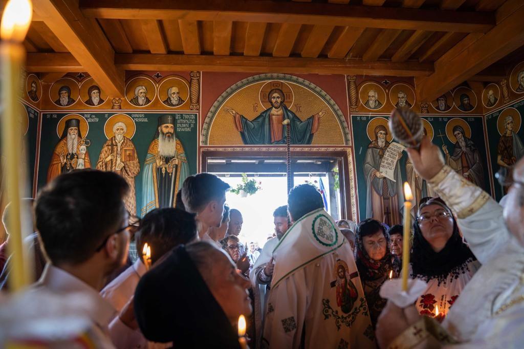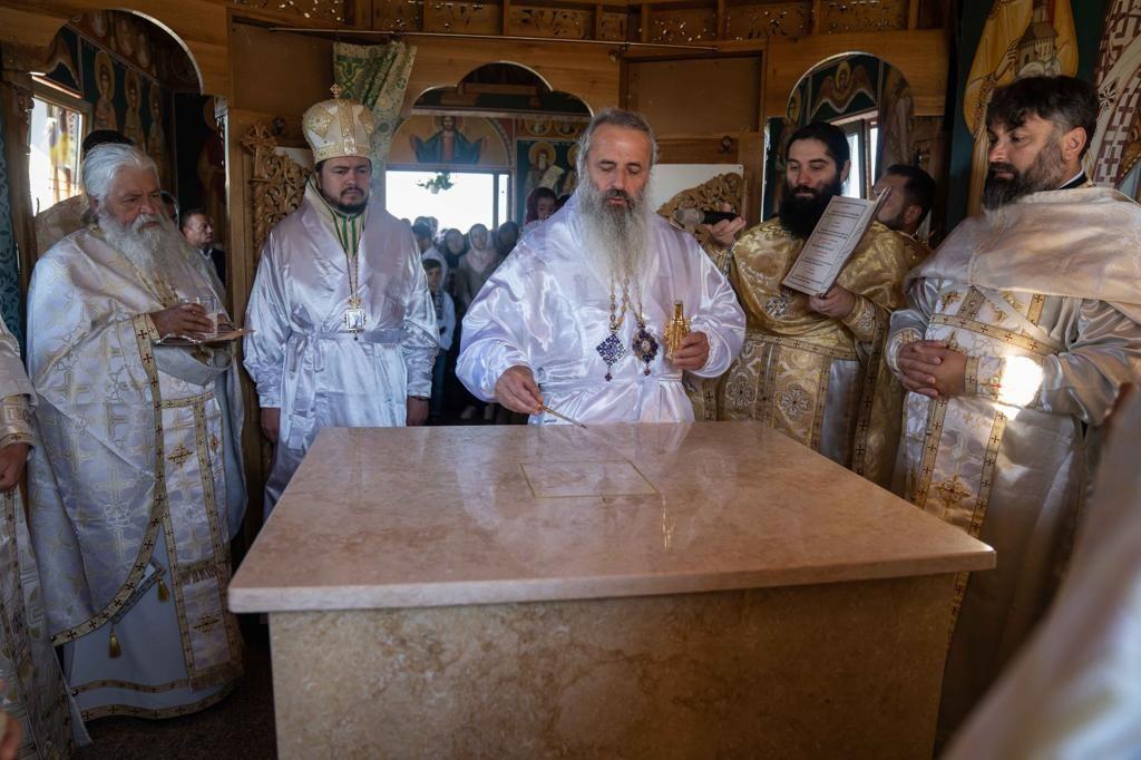 După tradiționala primire a ierarhilor cu flori, dar și cu tradiționala pâine și sare, lăcașul de închinare a fost sfințit la exterior și în interior prin ungere cu Sfântul și Marele Mir și stropire cu apă sfințită. De asemenea, Sfânta Masă din Altar a fost târnosită, împodobită și pregătită pentru sfintele slujbe.