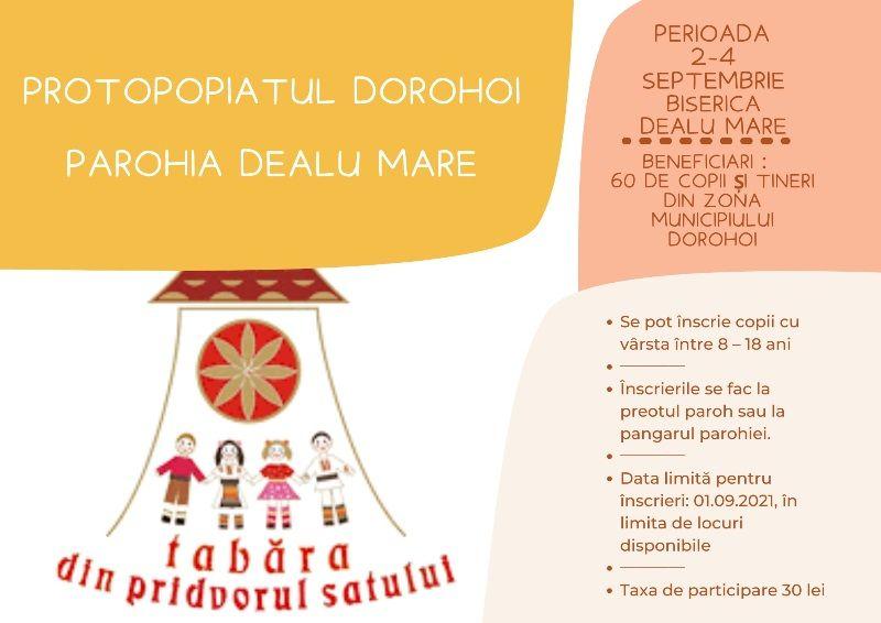 În perioada 2-4 septembrie, parohia Dealu Mare organizează a treia ediție a „Taberei din pridvorul satului”, proiect inițiat și susținut de Departamentul de Misiune pentru Tineret al Mitropoliei Moldovei și Bucovinei prin Asociația Tineretul Ortodox Român.