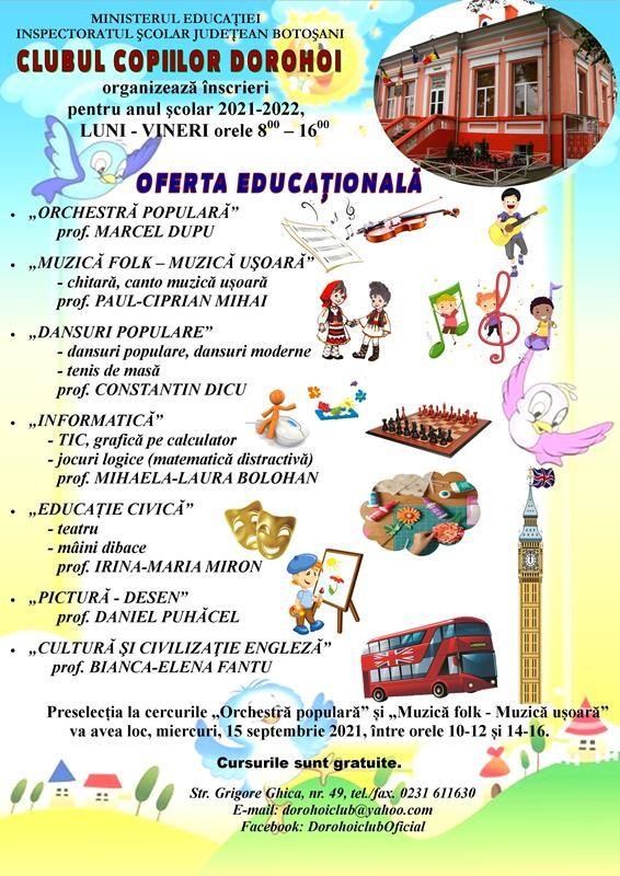 Începând de miercuri, 1 septembrie 2021, între orele 08:00-16:00, părinții, copiii și elevii din municipiul Dorohoi şi localităţile alăturate sunt aşteptaţi la Clubul Copiilor Dorohoi pentru înscrierea la activitățile instructiv-educative din oferta educațională a cercurilor care vor funcţiona în acest an școlar: