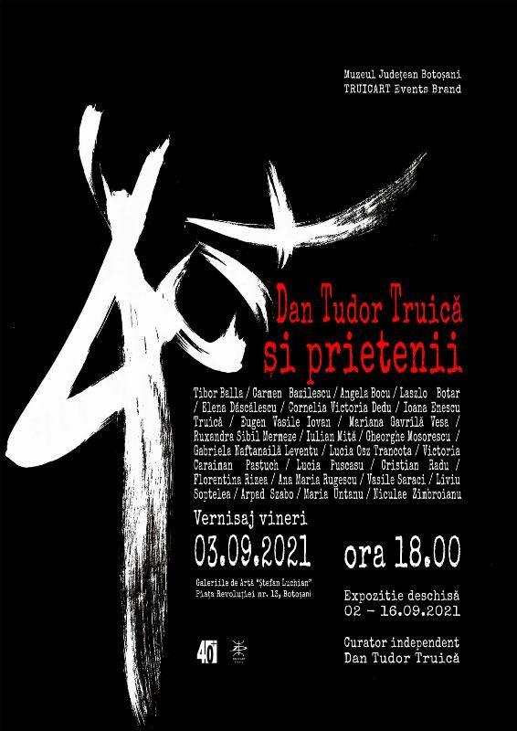Muzeul Județean Botoșani, TRUICART Events Brand și Dan Tudor Truică, curatorul evenimentului, au plăcerea să vă invite să participați la vernisajul expoziției internaționale de artă “40+ Dan Tudor Truică și prietenii”, a treia etapă, care va avea loc pe 3 septembrie 2021, ora 18.00, în Galeriile de Artă "Ștefan Luchian", Piața Revoluției nr. 13, Botoșani.