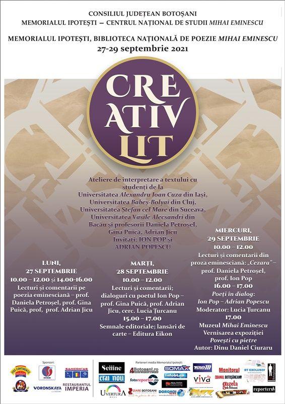Memorialul Ipotești – Centrul Național de Studii Mihai Eminescu organizează, în perioada 27-30 septembrie 2021, a treia ediție a Atelierelor de interpretare a textului CreativLit. La ateliere vor participa studenți de la Universitatea „Babeș-Bolyai” din Cluj, Universitatea „Al. I. Cuza” din Iași, Universitatea „Vasile Alecsandri” din Bacău, Universitatea „Ștefan cel Mare” din Suceava.