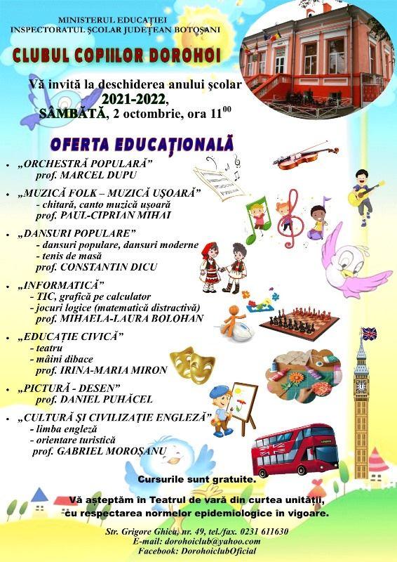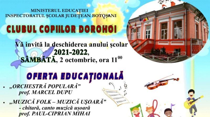 Festivitatea de deschidere a anului şcolar 2021-2022 va avea loc, sâmbătă, 2 octombrie 2021, începând cu ora 11:00, la sediul Clubului Copiilor Dorohoi.