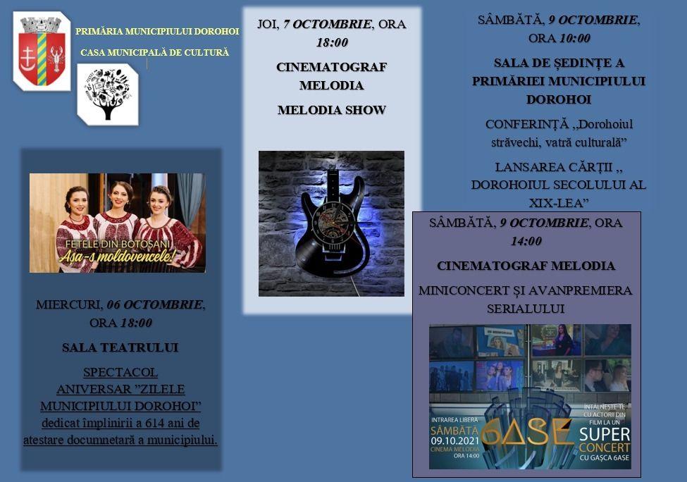 - JOI, 7 OCTOMBRIE, ORA 18:00, LA CINEMATOGRAF MELODIA – Vă așteptăm la un super concert susținut de cei mai talentați dorohoieni: „MelodiaShow”. Spectacolul se va lansa sub un alt concept, dând viață unui nou capitol al Dorohoiului: o nouă poveste construită de oameni, de muzică și de felul în care ne unește pe toți. Haideți să facem petrecerea aceasta una de neuitat!