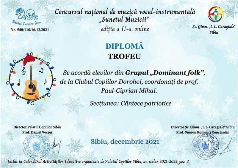 Clubul Copiilor Dorohoi a fost reprezentat de 5 eleve de la Cercul „Muzică folk-muzică ușoară” (coordonat de prof. Paul-Ciprian Mihai). Grupul „Dominant folk" (format din Adelina-Dumitrița Cusîn, Camelia-Maria Chelariu, Eliza Stan, Ștefania Horopciuc și Veronica Horopciuc) care a concurat la secțiunea "Cântece patriotice" a obținut TROFEUL SECȚIUNII.