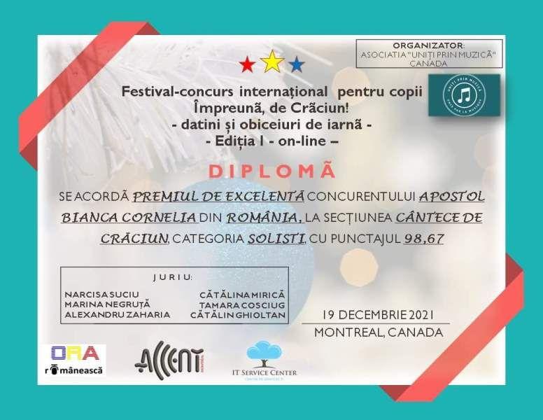 Bianca Apostol, elevă a Cercului "Muzică folk-muzică ușoară" (coordonat de prof. Paul-Ciprian Mihai), membră a Grupului VOCES de la Clubul Copiilor Dorohoi, a participat la Festivalul Internațional „Împreună de Crăciun” - Festival concurs de datini și obiceiuri românești pentru copiii români de pretutindeni, organizat de Asociația „Uniți prin muzică” Montréal, Québec, Canada.