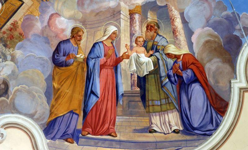 Pruncul Iisus este adus la Templul din Ierusalim de către Fecioara Maria și dreptul Iosif ofrandă lui Dumnezeu, aşa cum cerea vechea lege: „Orice întâi născut de parte bărbătească să fie hărăzită lui Dumnezeu în a 40-a zi de la naştere.  În acest moment se făcea şi curăţirea mamei”. În Templu au fost întâmpinaţi de dreptul Simeon şi prorociţa Ana.