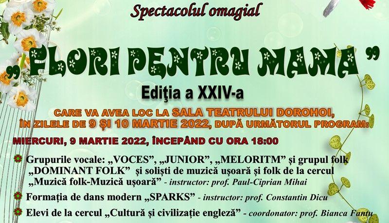 Sala Teatrului Dorohoi va găzdui în perioada 9-10 martie 2022 Concertul omagial „Flori pentru mama”, ediţia a XXIV-a, organizat de Clubul Copiilor Dorohoi, cu sprijinul Inspectoratului Şcolar Judeţean Botoşani şi al Primăriei municipiului Dorohoi, în parteneriat cu Asociaţia „Mugurelul” Dorohoi şi Casa Municipală de Cultură Dorohoi și Centrul Național de Informare Turistică Dorohoi.