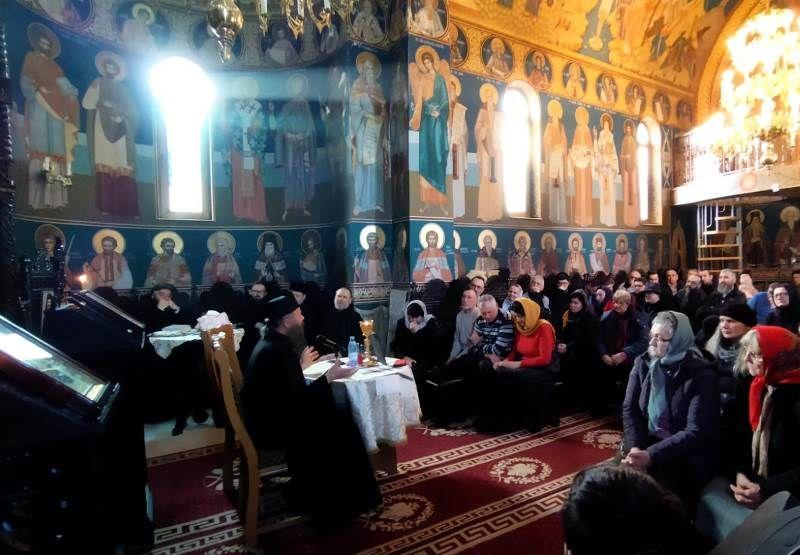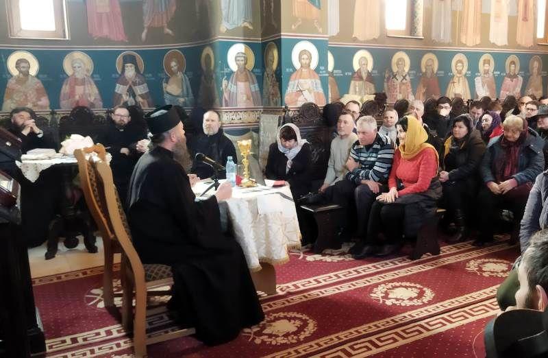 În prima parte a întâlnirii, după cuvântul de bun venit adresat celor prezenți, părintele stareț Ioan Harpa a introdus auditoriul în atmosfera de liniște și așezare specifică Postului Mare, subliniind valoarea și rostul teologic al rugăciunii ortodoxe, potrivit învățăturii Sfântului Grigore Palama, numit pe drept cuvânt „teologul luminii necreate”. După ce a conturat personalitatea intelectuală și duhovnicească a Sfântului Grigore, prin câteva exemplificări din viața și activitatea marelui ierarh, părintele stareț a pus la inima credincioșilor multe sfaturi practice privind practicarea și necesitatea rugăciunii în viața personală, în viața de familie și, mai ales, în biserică, care pentru noi, creștinii ortodocși nu este altceva decât „raiul sau paradisul din care am fost alungați din cauza păcatului și neascultării noastre și în care putem să fim primiți prin pocăința propovăduită de Hristos, Domnul Vieții veșnice”. În finalul cuvântului, pus la inima ascultătorilor, părintele stareț a explicat de ce avem nevoie de un program foarte bine rânduit de rugăciune în viața de creștin, precizând că „toate pleacă de la rugăciune și că atunci când omul începe să se roage, în viața lui sunt realizări de tot felul, iar lipsa rugăciunii duce la un blocaj existențial”. Prin rugăciunea asumată în mod responsabil, viața de membru al Bisericii devine o călătorie cu Hristos, în Hristos și spre Hristos, spre mântuirea dorită de fiecare muritor, după modelul oferit de marii sfinți rugători așezați înaintea noastră în anul omagial al rugăciunii isihaste: Sfântul Simeon Noul Teolog, Sf. Grigorie Palama și Sfântul Paisie de la Neamț.