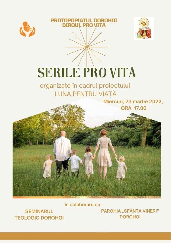Activitatea face parte din programul „Serilor Pro Vita” desfășurate în luna martie, la diverse parohii din municipiu, cu participarea elevilor Seminarului Teologic „Sfântul Ioan Iacob” Dorohoi. Prima din „Serile Pro Vita” a avut loc deja pe data de 17 martie, fiind găzduită de Parohia Învierea Domnului, prin bunăvoința Părintelui Ciprian Munteanu; cea de a doua activitate va avea loc la parohia Sfânta Vineri, pe data de 23 martie, cu participarea părintelui Călinescu Bogdan Mihail și părintelui Budacă Teodor Cătălin, iar cea de a treia întâlnire pro vita va fi organizată la Parohia Nașterea Maicii Domnului, Trestiana, cu sprijinul părintelui Chichioacă Petru Georgel.