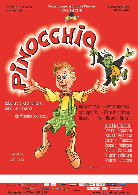 Spectacolul „Pinocchio”, după Carlo Collodi, adaptarea, dramatizarea şi regia artistică este semnată de Valentin Dobrescu. Scenografia îi aparţine lui Mihai Pastramagiu, iar muzica este compusă de Alin Macovei Moraru.