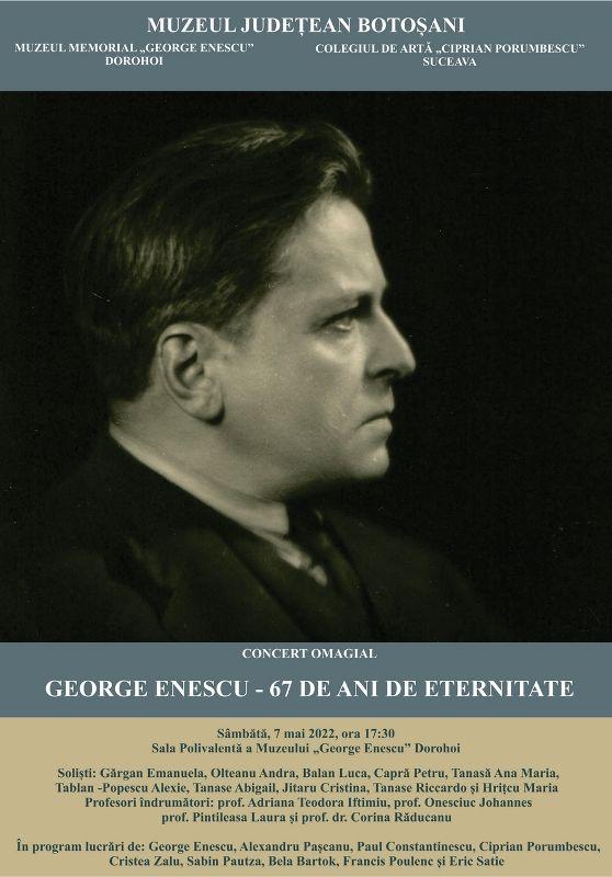 Muzeul Memorial „George Enescu” Dorohoi, organizează sâmbătă, 7 mai 2022, ora 17:30, concertul omagial George Enescu – 67 de ani de eternitate.