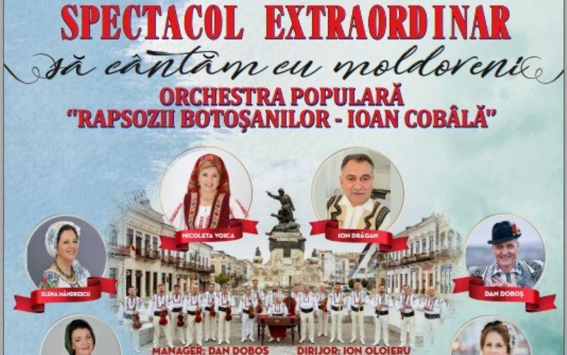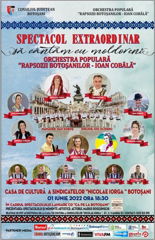 Așadar, Orchestra Populară „Rapsozii Botoșanilor” Ioan Cobâlă vă invită la un spectacol extraordinar în data de 1 iunie, începând cu ora 18.30, la Casa de Cultură a Sindicatelor „Nicolae Iorga” Botoșani, intitulat „Să cântăm cu moldoveni”.