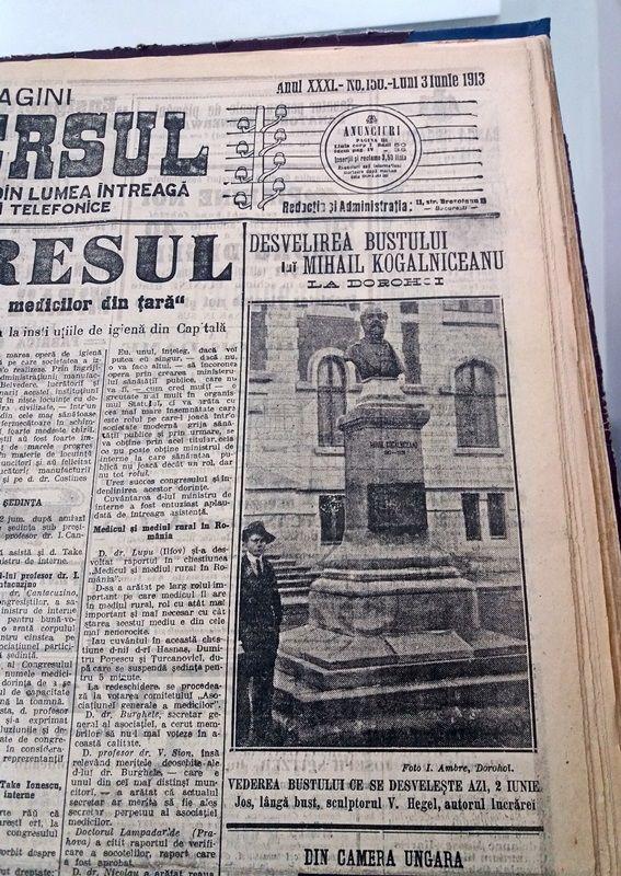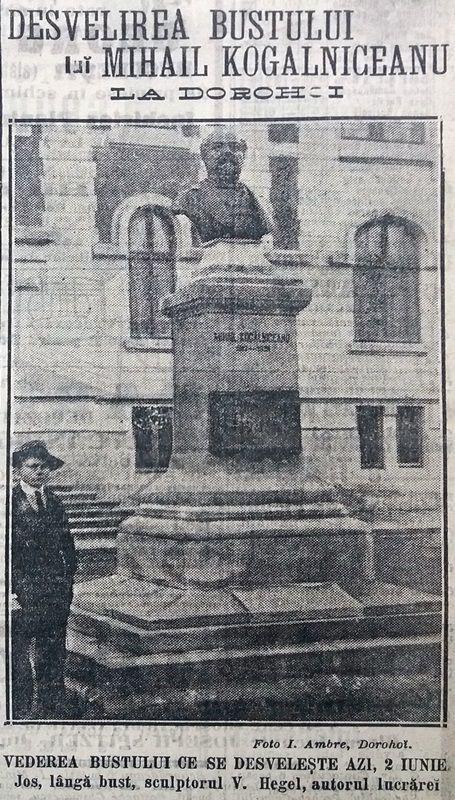 Fotografia alăturată a apărut pe prima pagina din acest ziar pe data de 3 Iunie 1913 și informa cititorii despre DESVELIREA BUSTULUI LUI MIHAIL KOGALNICEANU - LA DOROHOI. În fotografia surprinsă de I. Ambre, la acea vreme, regăsim pe lângă statuia din fața Primăriei și pe autorul sculpturii - V. Hegel, cu mențiunea: VEDEREA BUSTULUI CE SE DESVELEŞTE AZI, 2 IUNIE.
