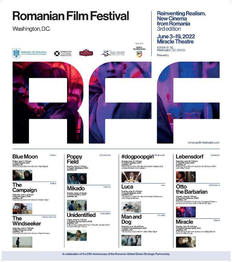 Cea de-a treia ediție a Festivalului de Film Românesc de la Washington, cel mai mare eveniment de promovare a cinematografiei naționale derulat în spațiul nord-american, debutează vineri, 3 iunie 2022, la Miracle Theatre, unul dintre cinematografele istorice din capitala americană. În acest an, festivalul este dedicat sărbătoririi a 25 de ani de la lansarea Parteneriatului Strategic dintre România și Statele Unite, important reper ale relațiilor bilaterale dintre cele două țări.