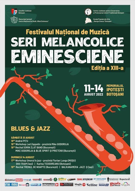 În serile dedicate folkului, vor urca pe scena festivalului SERI MELANCOLICE EMINESCIENE, pe 11 august – EMERIC IMRE (Cluj Napoca) și MIRCEA BANICIU ( București), iar pe 12 august – DANIEL IANCU (Constanța) și FĂRĂ ZAHĂR(Dorohoi). În zilele de 13 și 14 august, spectatorii vor avea parte de seri dedicate blues-ului și jazz-ului: pe 13 august vor evolua SORIN ZLAT (București), MIKE GODOROJA & BLUE SPIRIT și pritenii (București), iar pe 14 august, în cadul workshop-ului ținut de Florian Lungu (Moșu), a invitat – Formația DIXI TRAM (Iași),și în recital – TRENUL DE NOAPTE cu PETRESCU MARCIAN la harmonică (București) și BALKANAMERA JAZZ Q. cu LIVIU MĂRCULESCU la trombon și bucium (Iași).
