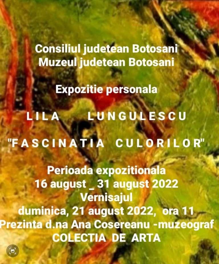 Muzeul Județean Botoșani găzuiește, în perioada 16 – 31 august 2022, în spațiul Colecției de Artă (Piața Revoluției nr. 12), expoziția personală „FASCINAȚIA CULORILOR”, cu lucrări de pictură semnate de artista LILA LUNGULESCU.