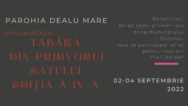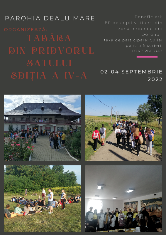 În perioada 02-04 septembrie 2022, parohia Dealu Mare organizează a patra ediție a „Taberei din pridvorul satului”, proiect inițiat și susținut de Departamentul de Misiune pentru Tineret al Mitropoliei Moldovei și Bucovinei prin Asociația Tineretul Ortodox Român.