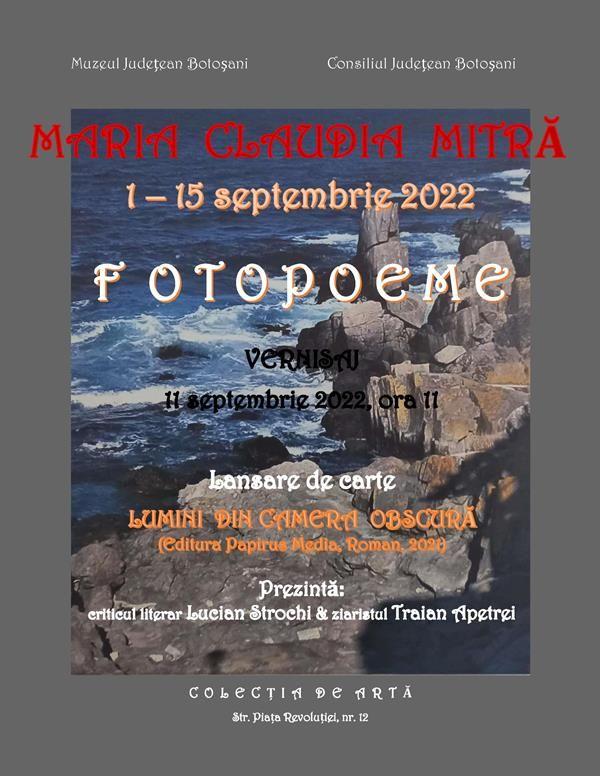 Muzeul Județean Botoșani vă invită, în perioada 1-15 septembrie 2022, să vizitați expoziția de fotografii „Fotopoeme”, deschisă în spațiul Colecției de Artă.