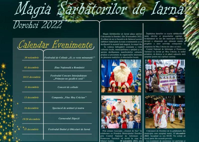 Festivalul Datini și Obiceiuri de Iarnă din Dorohoi va avea loc și în acest an pe data de 31 decembrie 2022 având ca loc de desfășurare piațeta Primăriei. Participanții la festival provin din municipiul Dorohoi și din zonele limitrofe acestuia însumând un număr de aproximativ 500 persoane. Seara se va încheia cu un spectaculos foc de artificii. Este un eveniment ce nu poate fi ratat!