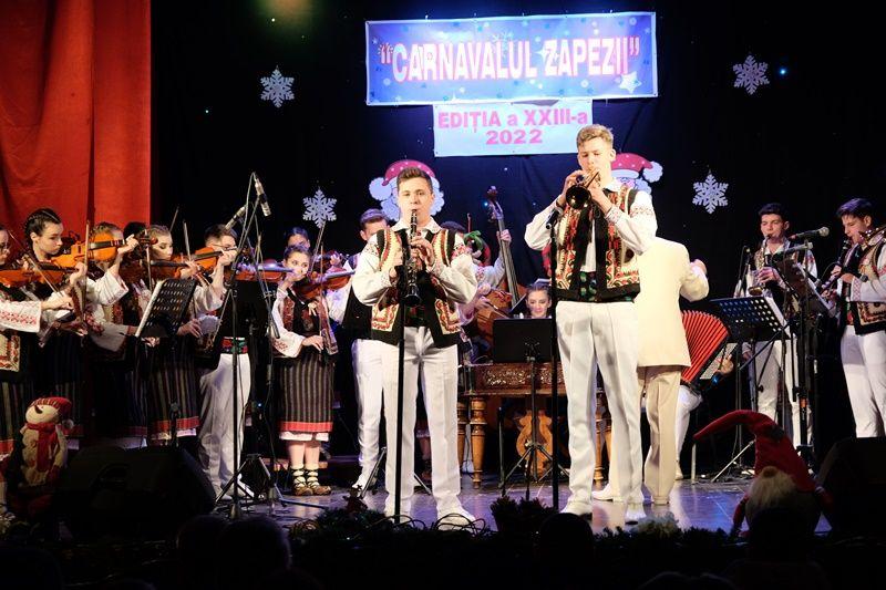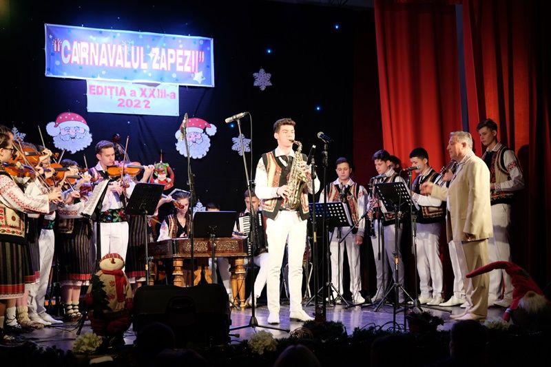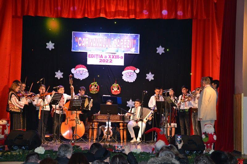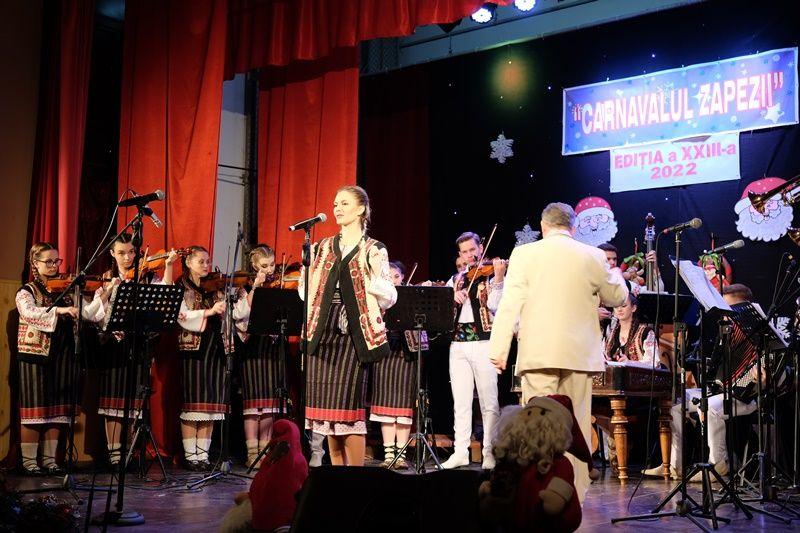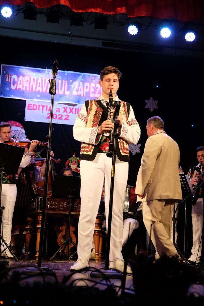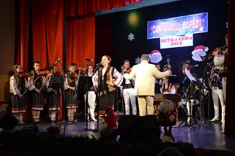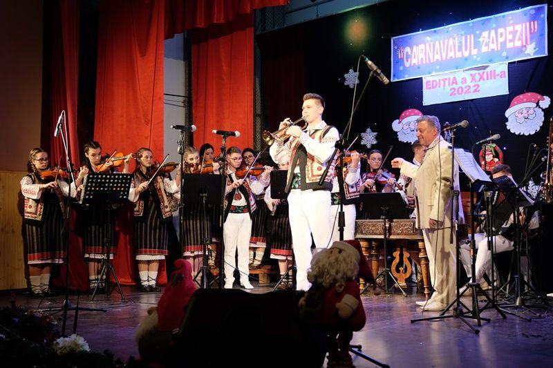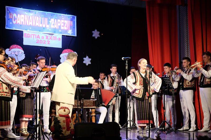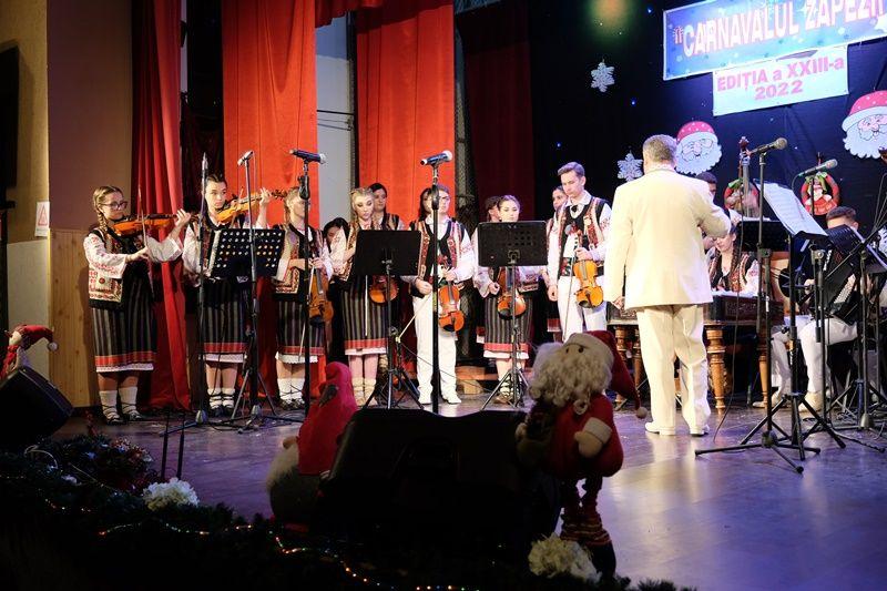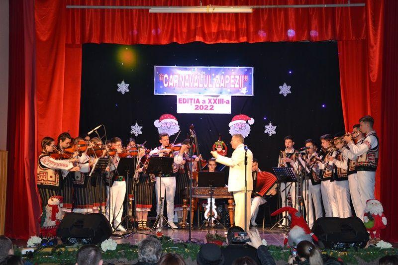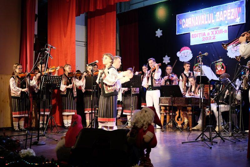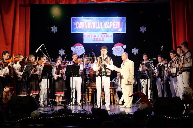 Locurile pe scenă au fost ocupate, apoi, de Orchestra mare „Mugurelul”, grupul care ne reprezintă municipiul în spectacole și festivaluri naționale și internaționale. Repertoriul prezentat la „Carnavalul Zăpezii” a fost unul bogat, cu melodii populare din diferite zone foclorice ale țării, interpretate de orchestră, soliști vocali și soliști instrumentiști.